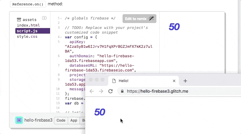 Set your credentials then click on the page to set a new value to the "random" Reference in our database, this then triggers our Reference.on( "value", … ) and its callback that extract the data from the snapshot (snapshot.val()) and update the text of our h1 element.