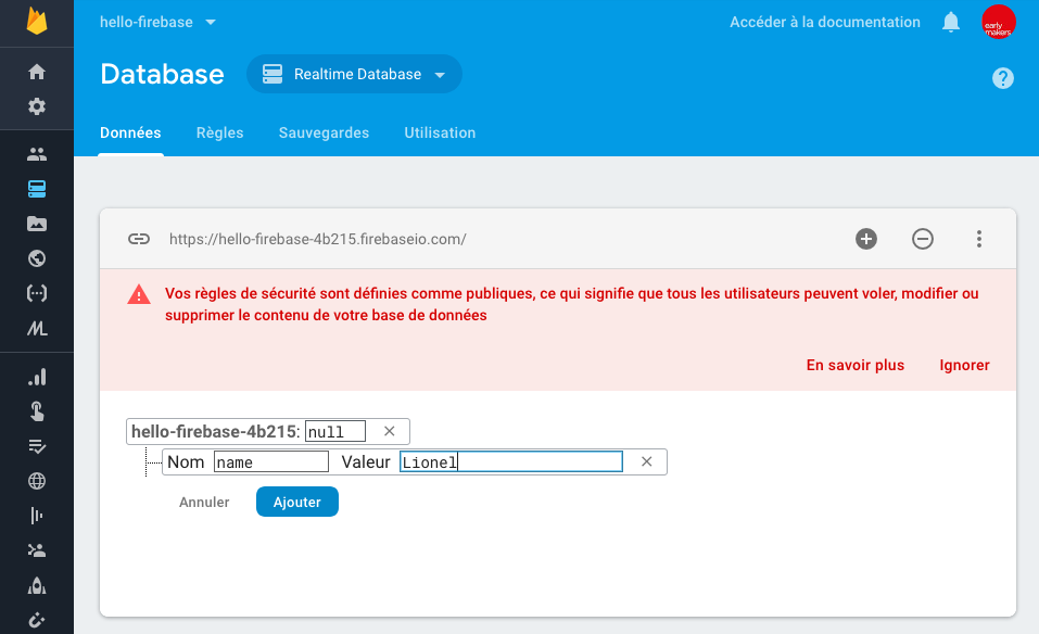 We can now write, update and delete data in our database. Let's see how to retrieve our data using the Reference.on() method: