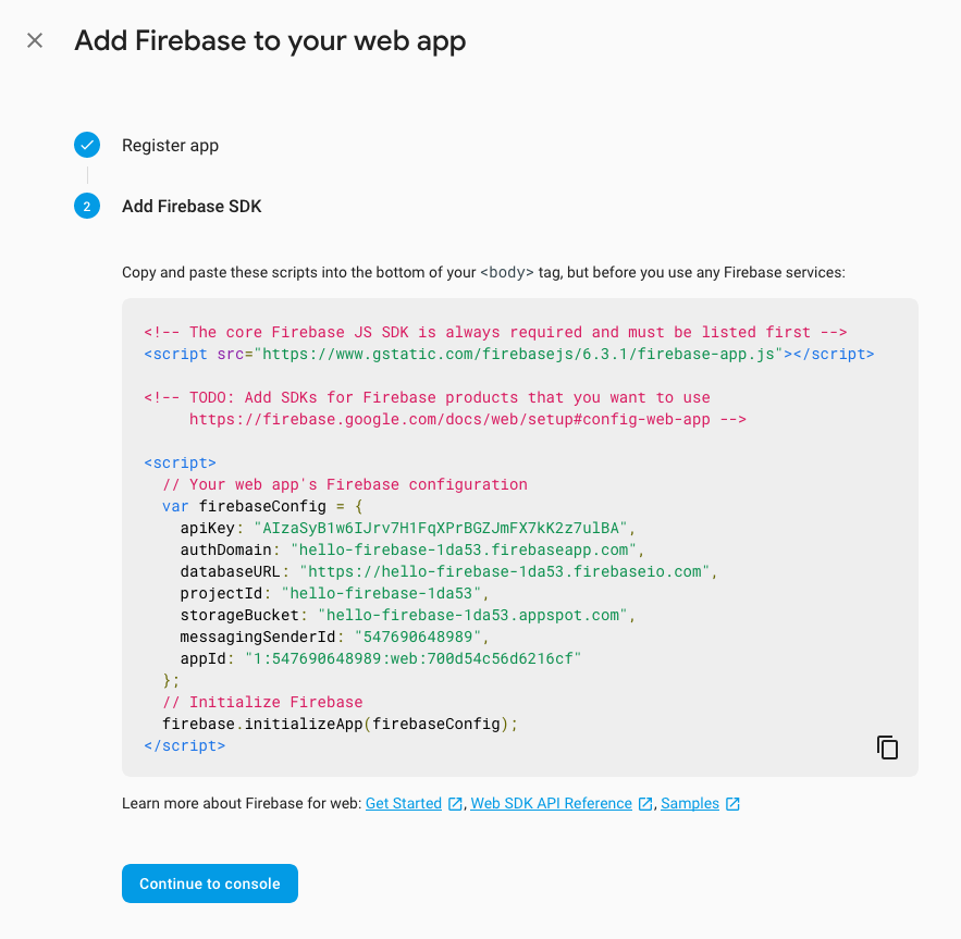 You can now click the "Continue to console" to get back to your Firebase project's settings and see your brand new registered app
