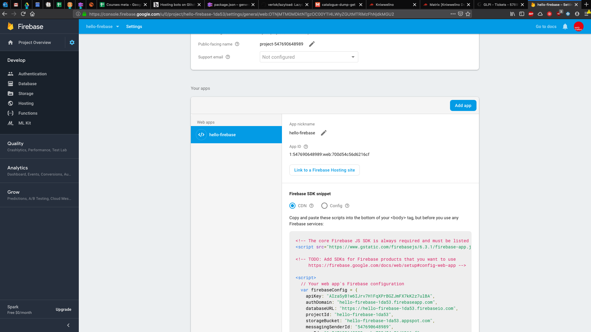 Firebase provides a handy setup to add to our web applications, it includes the link to a JS library to use Firebase as well as the configuration keys needed to access to our newly created database.